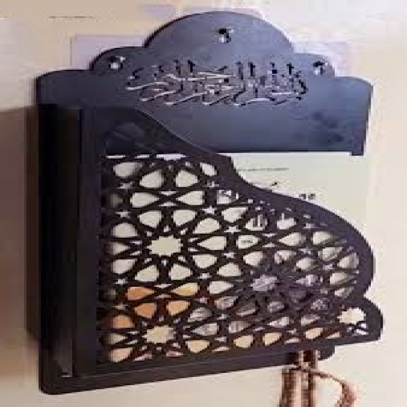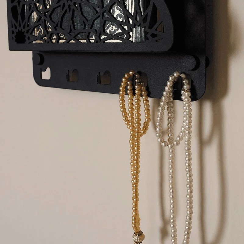 Practical and beautiful Quran Bookshelf for your home from Wall Art Istanbul, hangers for your tasbeeh and keys, too. Bismillah is Written at the Top of the Wall Quran Box Personalized Text Needed Here: Up to 16 Characters Designed and produced by Wall Art Istanbul with high-quality steel Easy to Hang 25 x 45 x 5 cm (10 x 18 x 2 inches) - 1.5 Kg (3.3 lbs) Cancellation and return are not accepted for personalized products